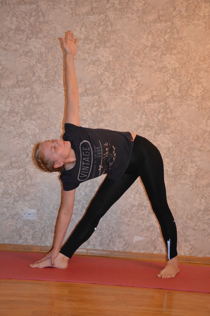 Очень мне нравилась уттихита триконасана. Поза треугольника. Такая вся вот йоговская, йоговская…..Я начала ее выполнять с усердием, и, считала, что она сразу получилась, ведь я с успехом доставала рукой до ступни. Даже незнаю сколько бы я делала триконасану в таком счастливом заблуждении, но однажды мне попалось ее описание и там было указано, что плечи должны быть в одной плоскости и, если стоять у стены, оба плеча касаются стены.